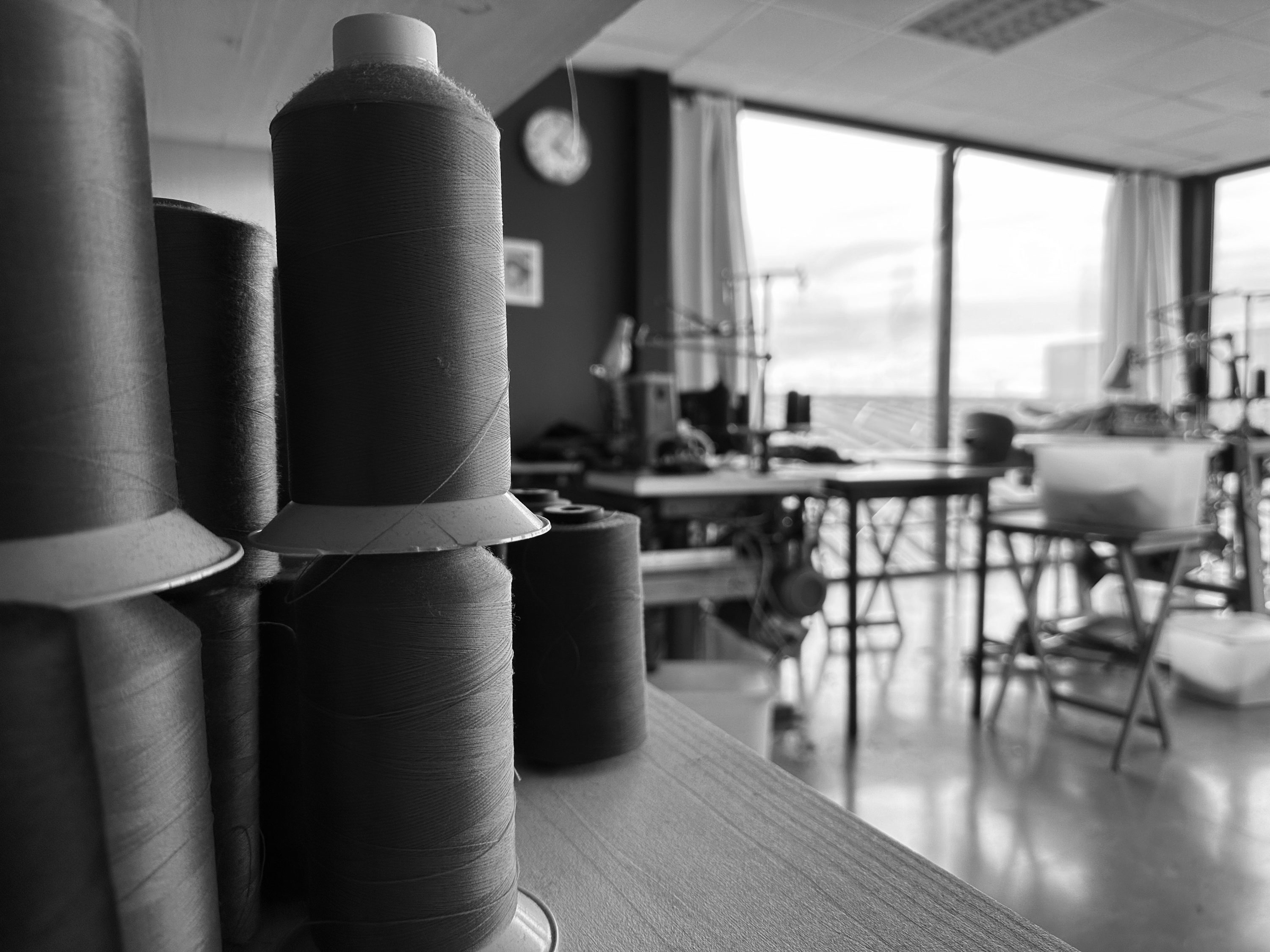 Une fois toutes les parties du vêtement coupées, elles peuvent être assemblées dans notre atelier de confection. Nous utilisons différentes machines qui ont chacune leur propre fonctionnalité, machine à bordure, surjeteuse, piqueuse plate.